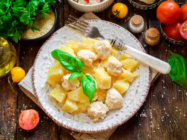 Тушеная курица с картошкой и стручковой фасолью готова.
