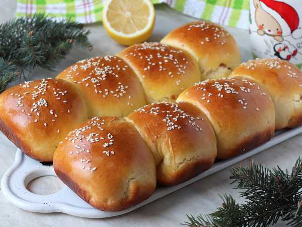 Перед выпечкой смазывать булочки не обязательно. Противень с булочками поставьте в предварительно разогретую духовку (180°С) и выпекайте около 15 минут до румяной корочки.