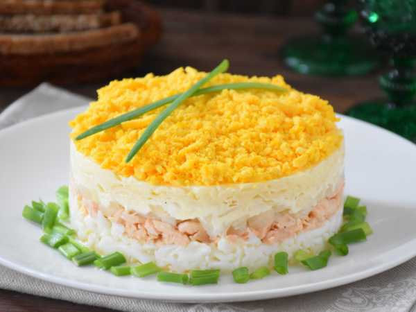 Картофель, морковь и яйца натрите на крупной тёрке. Слабосоленую семгу нарежьте на кубики. Лук нарежьте мелко (можно сбрызнуть лук лимонным соком, чтобы смягчить его вкус).