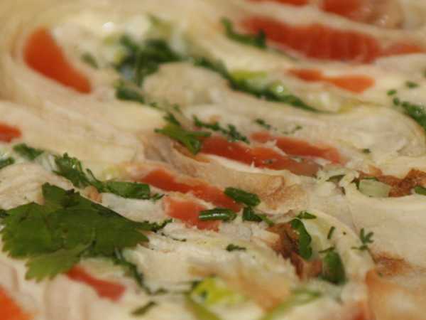 Украсьте на свой вкус. Я украсила майонезом из кондитерского мешка, нарезанным шнитт-луком и розочками из ломтиков семги, посыпала розовым перцем и дополнила красным луком.