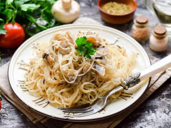 Для приготовления спагетти со сливочно-грибным соусом соберите продукты по списку.