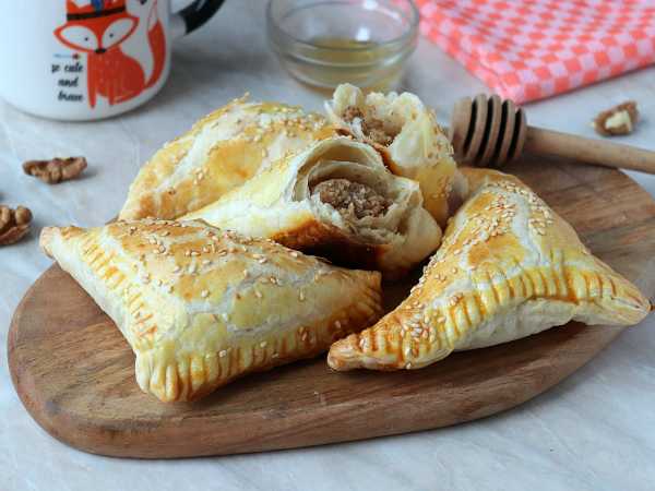Защипните края теста, соединяя противоположные части. Таким образом приготовьте все слойки.