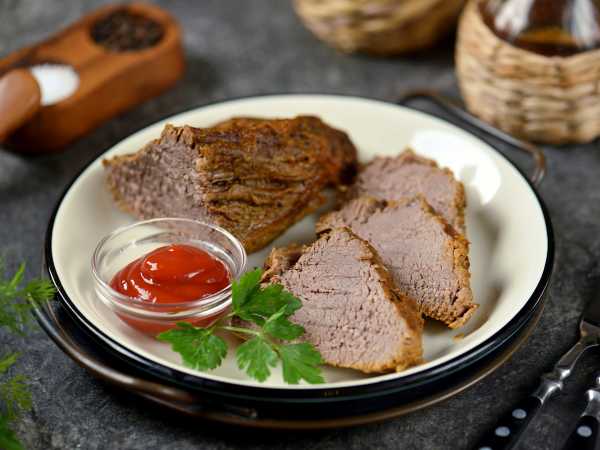 Поставьте в холодную духовку и готовьте при температуре 150°С около двух часов. Именно при пониженной температуре и длительном приготовлении говядина будет сочной и мягкой.