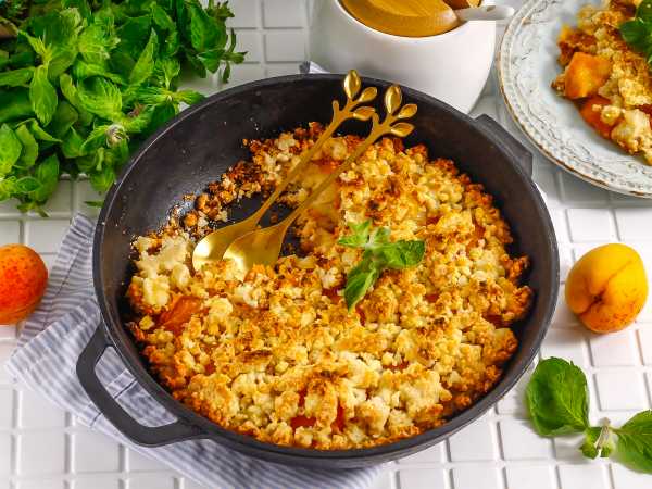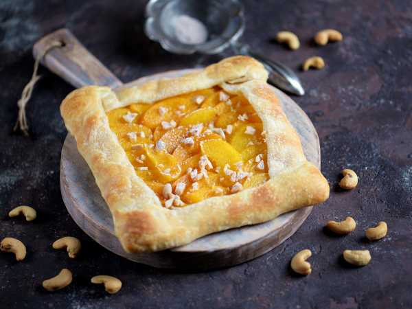 Соберите продукты для приготовления открытого песочного пирога с персиком и абрикосом.