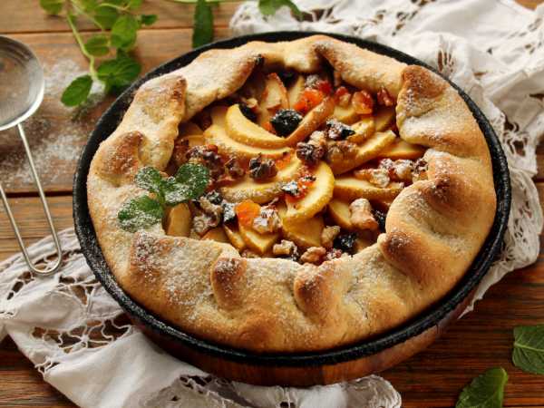 Присыпьте фрукты сахаром и сформуйте пирог, загнув бортики теста на начинку.