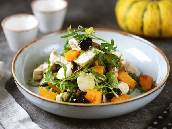 Откиньте рукколу на дуршлаг и промойте под проточной водой. Обсушите и выложите на порционное блюдо.
