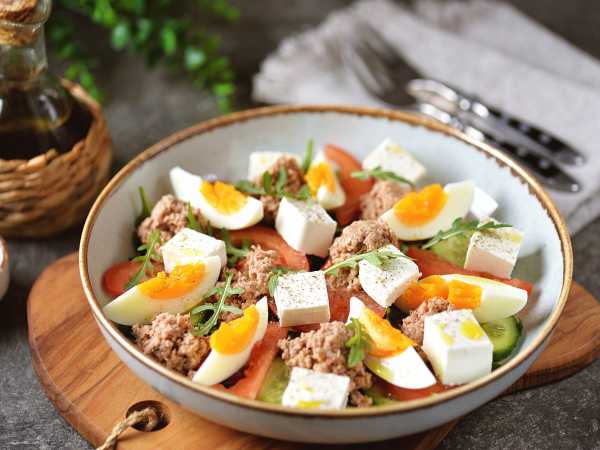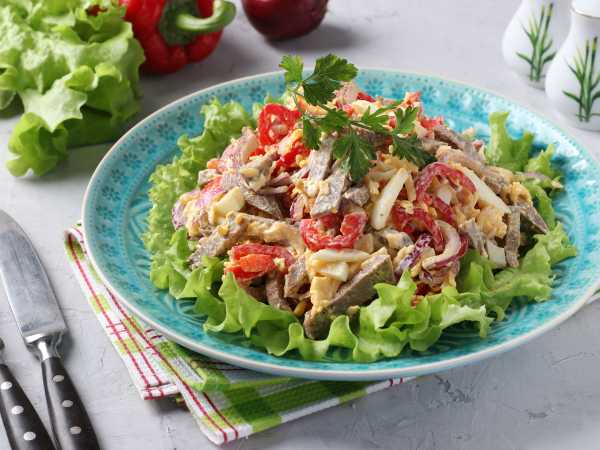 После приготовления выньте язык из бульона и опустите в ледяную воду. Затем снимите кожу. Всё, язык готов, можно приступить к приготовлению салата.