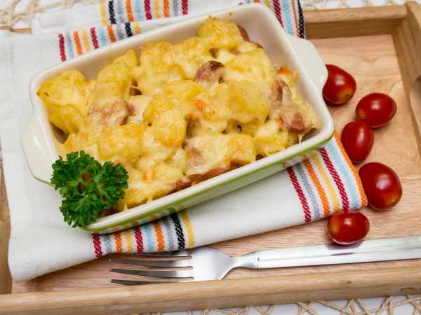 Форму накроем листом фольги (для равномерного запекания) и поместим в чашу аэрогриля. Чашу поставим в аэрогриль. Установим температуру на 200 градусов и готовим картофельную запеканку в аэрогриле 30 минут, затем снимем с формы лист фольги и продолжим дальше запекать - еще 30 минут. В общей сложности готовим запеканку в течение часа.
