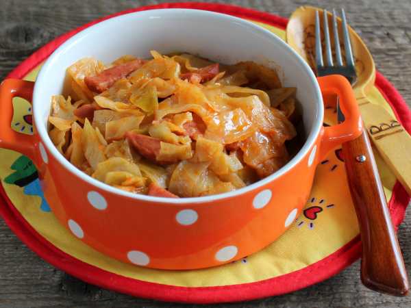 Через 1 час добавьте в бигус копчёности. Сосиски нарежьте кружочками, а грудинку - соломкой или кубиками. Потушите всё еще 15-20 минут.