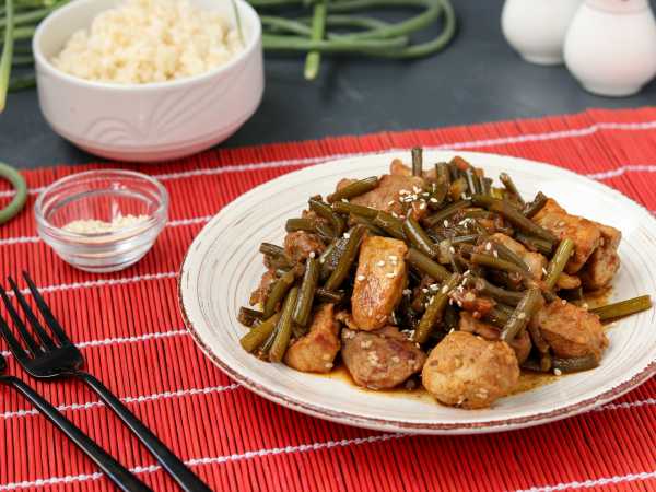 А свинину нарежьте очень тонкой соломкой. Готовиться она будет недолго, поэтому кусочки должны быть тоненькими, чтобы полностью прожарились.