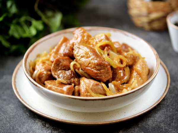 Приготовленное на сковороде мясо с луком-пореем особенно вкусно в сочетании с рисом. Приятного!