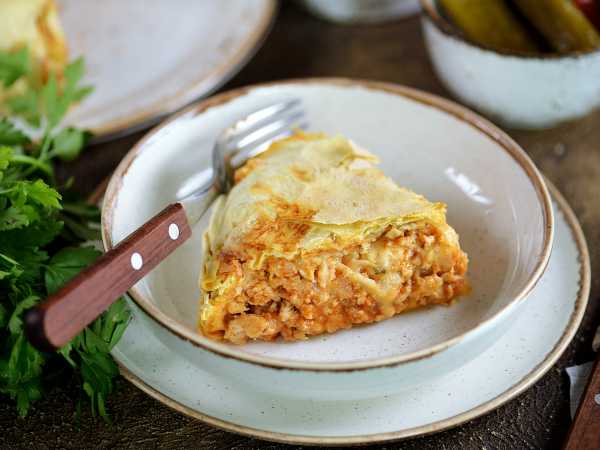 Сверху разложите лук, томленный в бульоне.