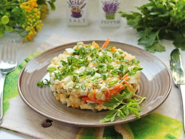 Выложите салат на тарелку в виде кольца. Украсьте маслинами и петрушкой.