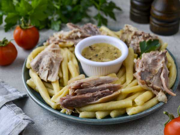 Не правильная подача на фото. Не показаны бульон и мясо. Тесто отваривается в том же бульоне, где варилось мясо.