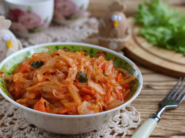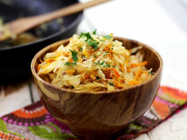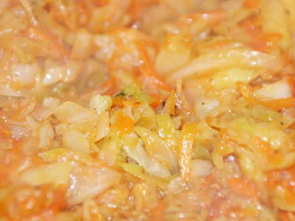 Капусту нашинкуйте соломкой и добавьте в сковороду с морковью и луком. Посолите по вкусу, можно добавить черный молотый перец и ваши любимые приправы.