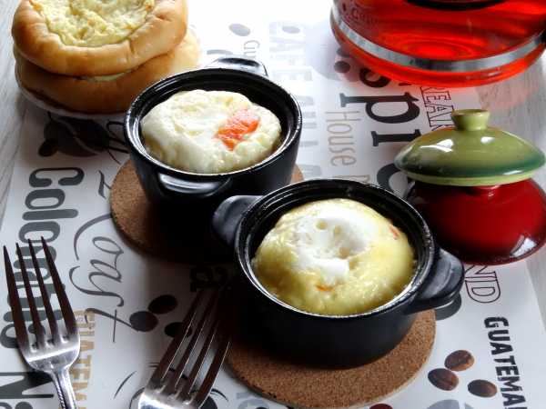Если омлет не дрожит в центре - он готов. Подавайте готовый омлет в порционных формочках или выложите на тарелку и гарнируйте на свой вкус (например, зеленым горошком, свежим помидором и т.д.).