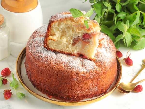 После этого срежьте верхушку и удалите бортики разъемной формы. Затем накройте пирог тарелкой и переверните дном вверх. Аккуратно удалите дно формы и дайте шарлотке слегка остыть. При желании ее можно присыпать сахарной пудрой или полить сиропом. Нарежьте выпечку на части и подайте к столу.