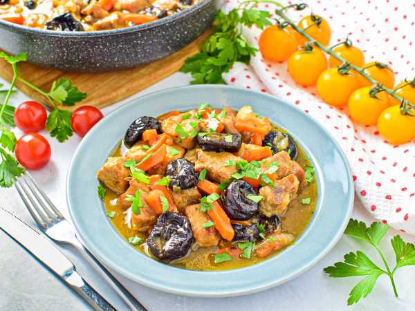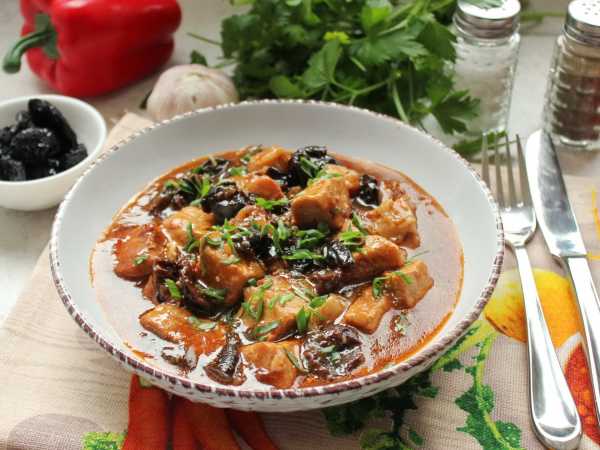 Для приготовления тушеной свинины с черносливом на сковороде соберите все необходимые ингредиенты по списку. Мясо берите без костей. Хорошим вариантом будет свиная шея или окорок.