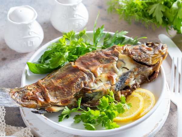 Запекайте кету с луком и майонезом в духовке (предварительно разогрев её) около 15-20 минут.