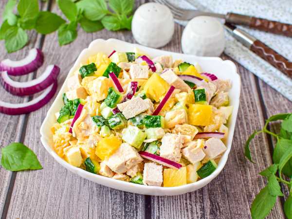 Салат «Курочка ряба» с ананасом готов.