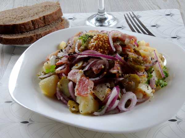 Пока жарятся яйца, разминаем картошку вместе с содержимым сковороды. Без фанатизма, при немецком способе приготовления мясорубка не нужна. На этом этапе солим и перчим во вкусу. Впрочем, можно этого и не делать, ведь каждый может приправлять лабскаус самостоятельно в своей тарелке.