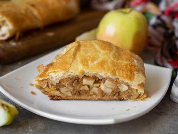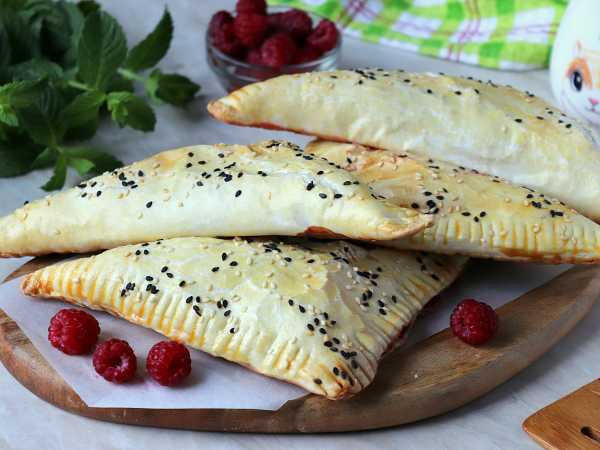 Слоеное тесто немного раскатайте и нарежьте полосками. Параллельно включите и разогрейте духовку, установите температуру 180 градусов.