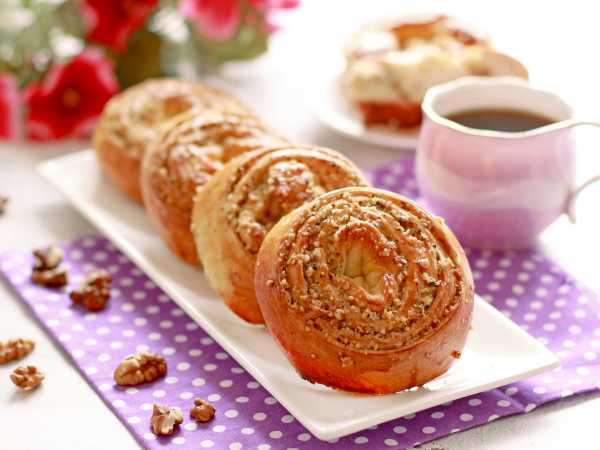 Все эти заготовки выложите на противень, застеленный пергаментом для выпекания. Каждую заготовку будущей булочки смажьте взболтанным яйцом. Выпекайте дрожжевые булочки с орехами и корицей 30 минут в уже заранее разогретой до 180 градусов духовке.