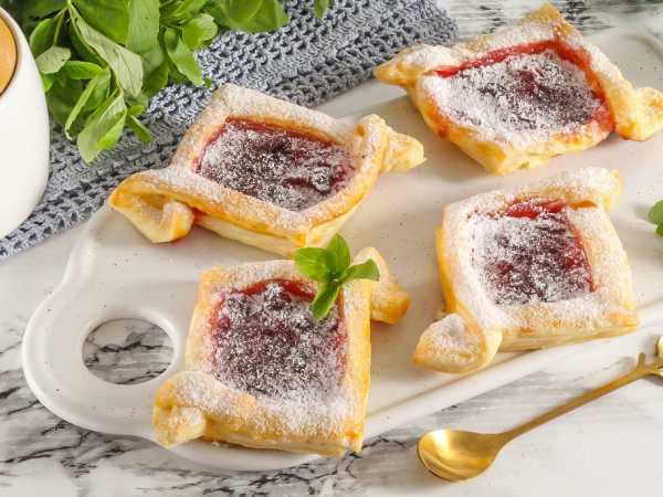 Размороженное слоеное дрожжевое тесто выложите на поверхность, присыпанную мукой.