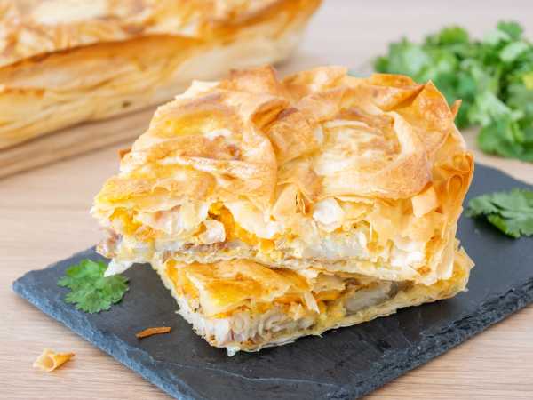 Когда пирог будет готов, на горячую начинку из кеты уложите остальной томлёный лук.