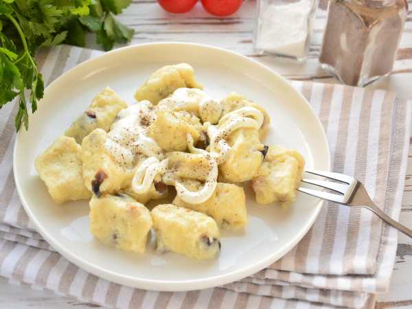 Содержимое сковороды выкладываем в тарелку поверх клецок и подаем к столу. Приятного аппетита!