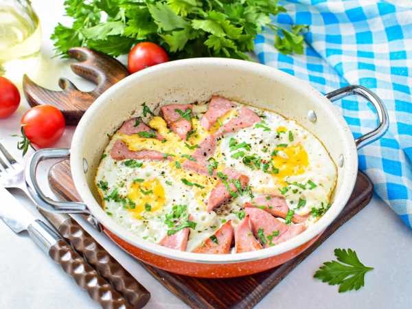 Соберём необходимые ингредиенты для приготовления яичницы с колбасой и сыром на сковороде.