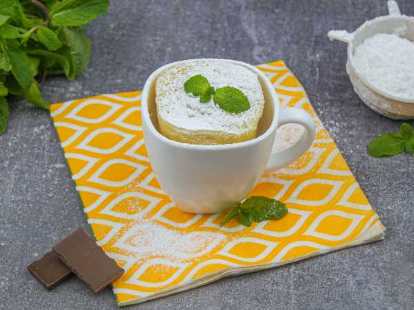 Готовьте постный кекс в кружке в микроволновке (без яиц и молока) на мощности 600 Вт в течение 3-х минут.