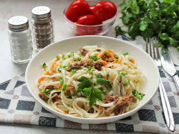 Выложите макароны в сковороду к тушенке, перемешайте. Можно добавить немного специй. Подержите на огне еще 3-5 минут.
