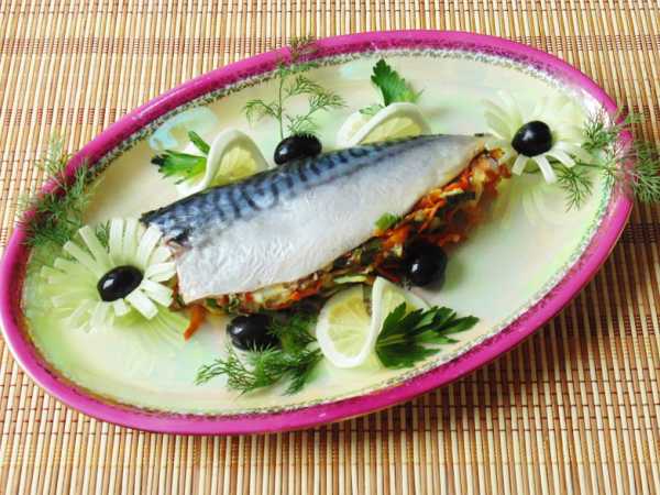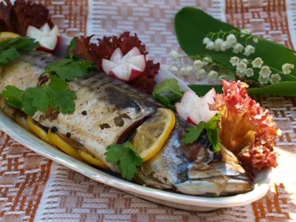 Готовую запеченную скумбрию вытащите из духовки и переложите на тарелку. Посыпьте свежей зеленью и сразу подавайте к столу, в горячем виде.