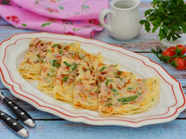 Затем переверните на другую сторону широкой лопаткой и допеките еще 1-2 минуты. Выложите блины с припеком из колбасы на тарелку. Таким же образом приготовьте и остальные блинчики.