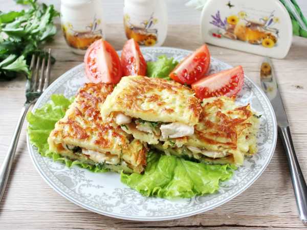 Приготовление блинов с курицей и луком лучше начинать с начинки, так как курицу нужно предварительно сварить.