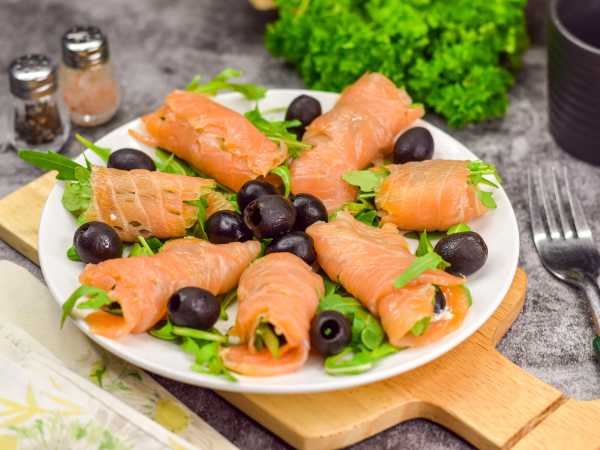 Аналогично приготовьте все рулетики из красной рыбы с маслинами и руколой, уложите их на тарелку. Для красоты добавьте зелени. Подавайте закуску к столу.
