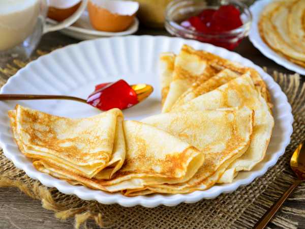 Подавайте блины с чем любите: сметаной, вареньем, маслом, джемом.