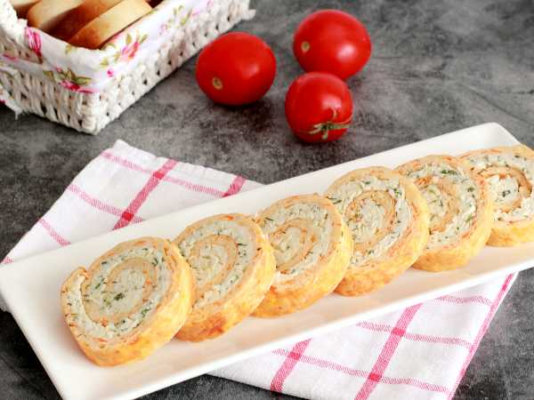 В результате должен получиться плотный рулет из омлета. Аккуратно переложите его на разделочную доску и нарежьте на порционные кусочки шириной 2 см. Готовый омлет по-корейски подавайте в горячем виде, украсив свежей зеленью.