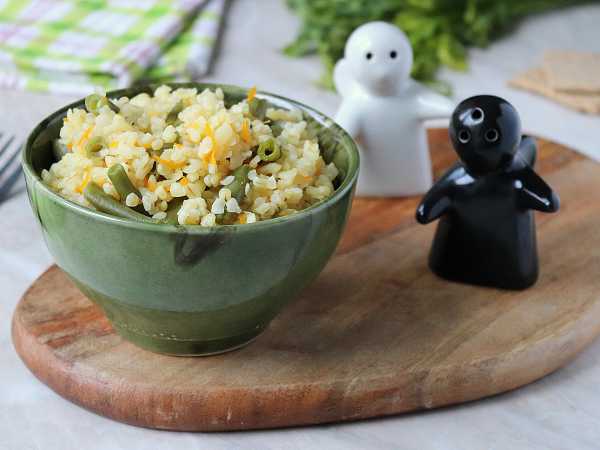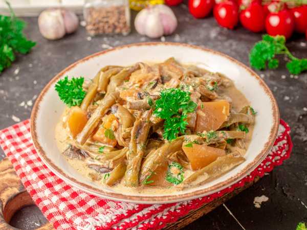 Прогреть стручковую фасоль с луком и чесноком на сковороде ещё пару минут, и можно снимать с огня.