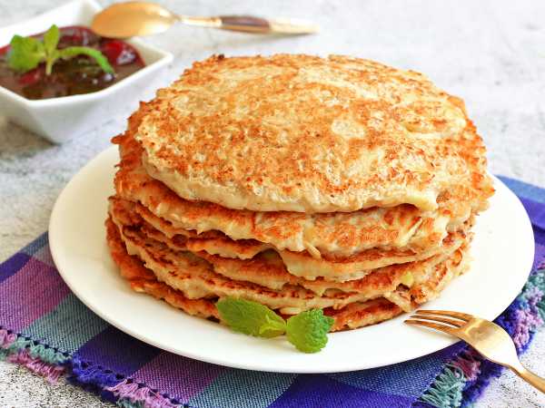 Блины готовы к подаче. К ним можно подать сметану, варенье, сгущенное молоко, джем. А для начинки творог смешайте с сахаром и сметаной по вкусу, положите на овсяноблин. Банан очистите, нарежьте кружочками, положите на творожную массу.