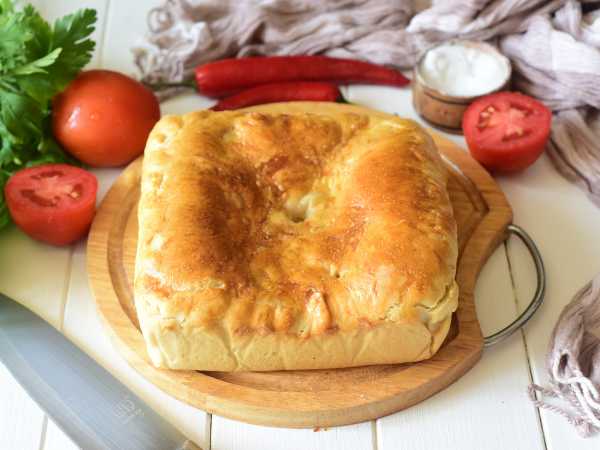 Нагрейте духовку до 160°С, поместите пирог в нагретую духовку и выпекайте около 45-60 минут. Температуру не повышайте, иначе начинка может не пропечься, а сверху пирог уже сгорит.