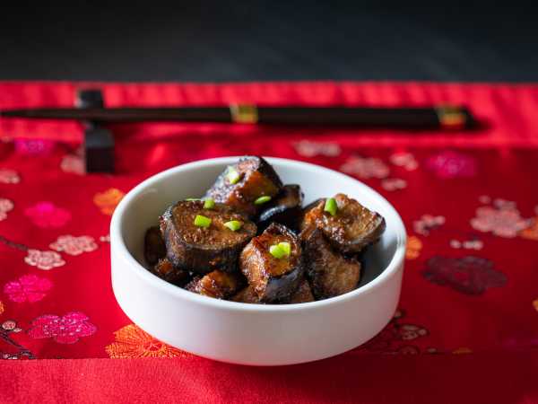 Баклажаны должны полностью впитать масло с поверхности сковороды. После этого огонь следует уменьшить до слабого и вмешать пасту мисо, соевый соус, мирин и сахарный песок так, чтобы они равномерно намазались на баклажаны.