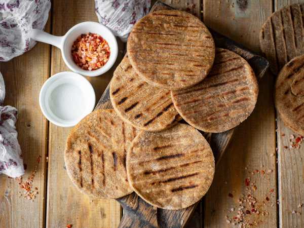 Сковороду-гриль смажем тонким слоем растительного масла, хорошенько разогреем на среднем огне, выложим несколько заготовок и обжарим постные ржаные лепешки на сковороде с двух сторон до заметных подпалин.
