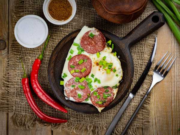 Жарьте яичницу около 3-х минут, чтобы схватился белок. Желток можете оставить в жидком состоянии, если любите глазунью. Если предпочитаете полностью прожаренный желток, то готовьте яичницу под крышкой.