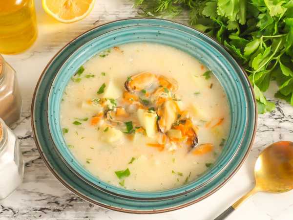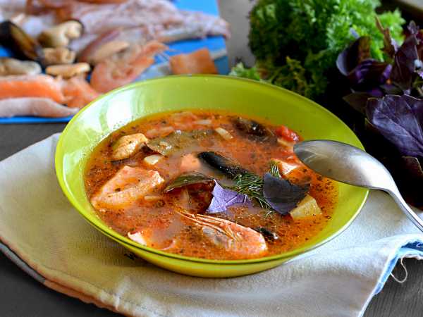 Доведите рыбный бульон до закипания, забросьте в него кальмара. Когда снова закипит, добавьте содержимое сковороды и мидии. Перемешайте, поварите полминуты и снимите с огня. При желании придать супу ароматную кислинку, используйте лайм. Для более сильной остроты пригодится какой-нибудь вариант соуса чили, даже если он от других национальных кухонь: пири-пири, табаско, шрирача и т.д.