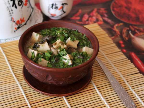 Тофу и эноки долго готовить не нужно, их закладываем в самом конце вместе с нарубленным чесноком и зеленым луком. Проварим всё вместе минут 5-7, и суп готов.
