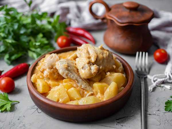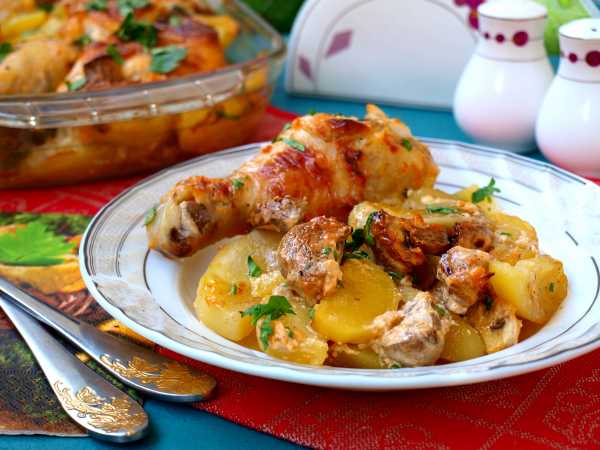 В форму налейте несколько столовых ложек бульона или воды. Накройте фольгой и поставьте в духовку, разогретую до 190 градусов. Запекайте куриные крылышки с картошкой и грибами в духовке 40-45 минут. После фольгу снимите и готовьте блюдо еще 20-25 минут, до мягкости всех ингредиентов.
