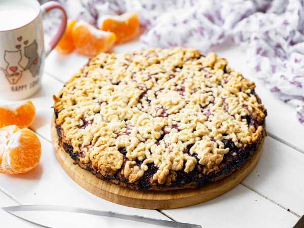 Подмороженную меньшую часть теста освободим от пленки и натрем на крупной терке поверх слоя из варенья. Отправим пирог выпекаться в уже разогретую до 180 градусов духовку на 30 минут.