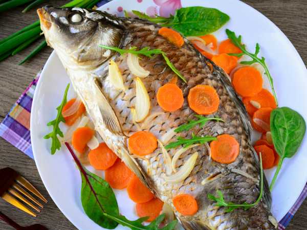 Готового карпа подаем к столу на блюде в горячем виде. Приятного аппетита!